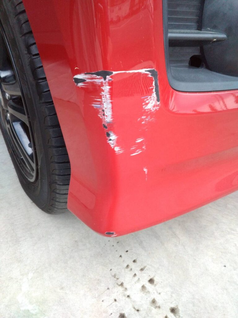 ホンダ Nワゴンのフロントバンパーの角部分に、塗装が削れた擦り傷がありました。赤いボディカラーの下地が剥がれ、黒いバンパー素材が見えてしまっており、外観上も目立つ状態でした。