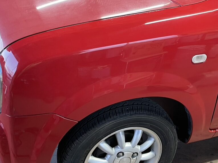 バンパーを滑らかな状態に戻すため、古い塗料を丁寧に剥がし、下地処理からやり直しました。その後、ラパン本来のボディカラーに合わせて調色した塗料で再塗装を施し、自然な仕上がりを目指しました。
