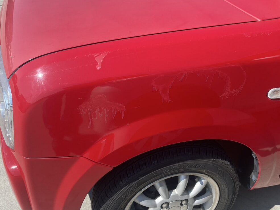 スズキ ラパンのフロントバンパーに、お客様がご自身で補修を試みたような跡が複数あり塗料が厚く塗られて垂れた跡が、かえって傷を目立たせてしまい、車のデザインを損ねていました。