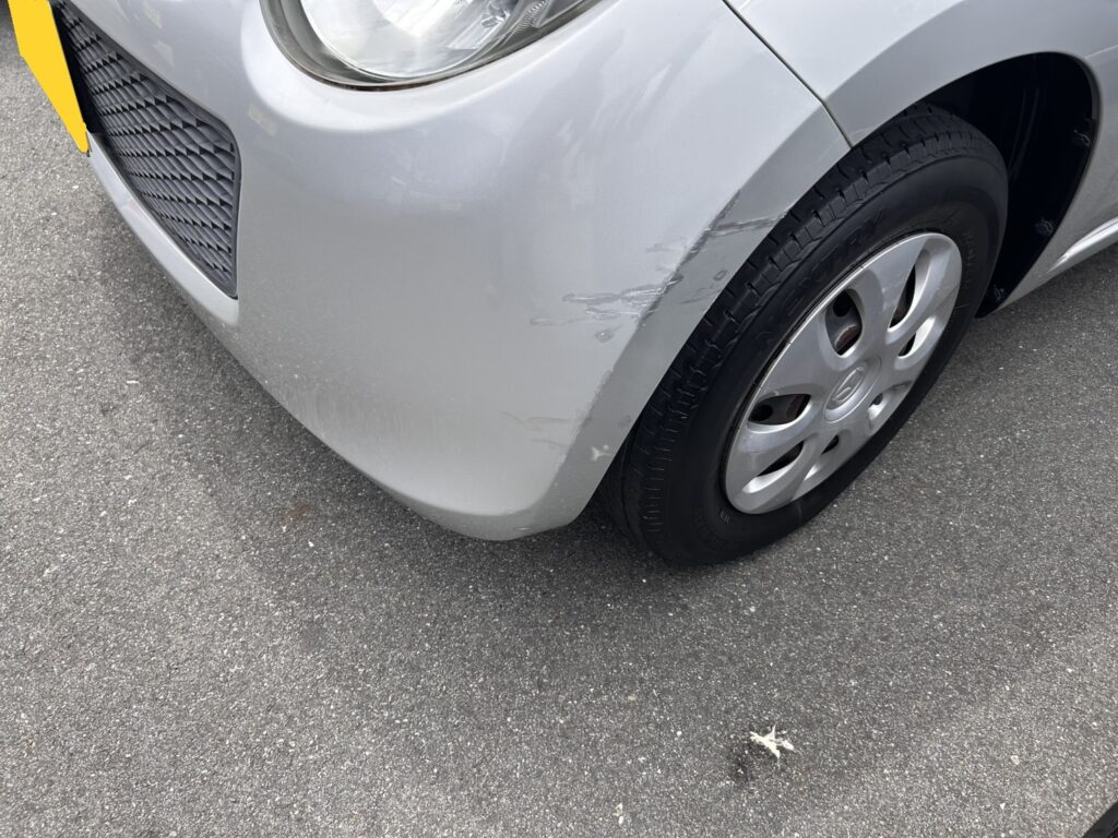 シルバーのマツダ キャロルのフロントバンパーに、お客様ご自身で補修を試みたような跡があり、塗装箇所の色の差が目立っていました。