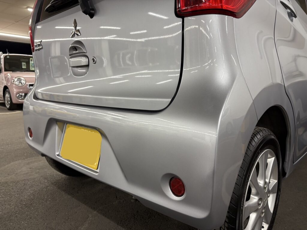三菱 eKワゴンのリアバンパーに遠目には小さく見える傷がついていました。オーナー様ご自身で傷を補修されたのか、塗料が周囲と馴染まず、かえって補修跡が目立ち美観を損ねていました。