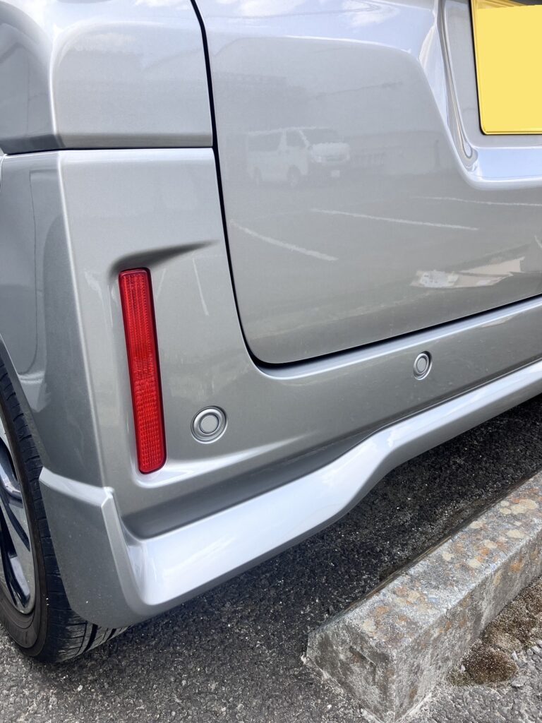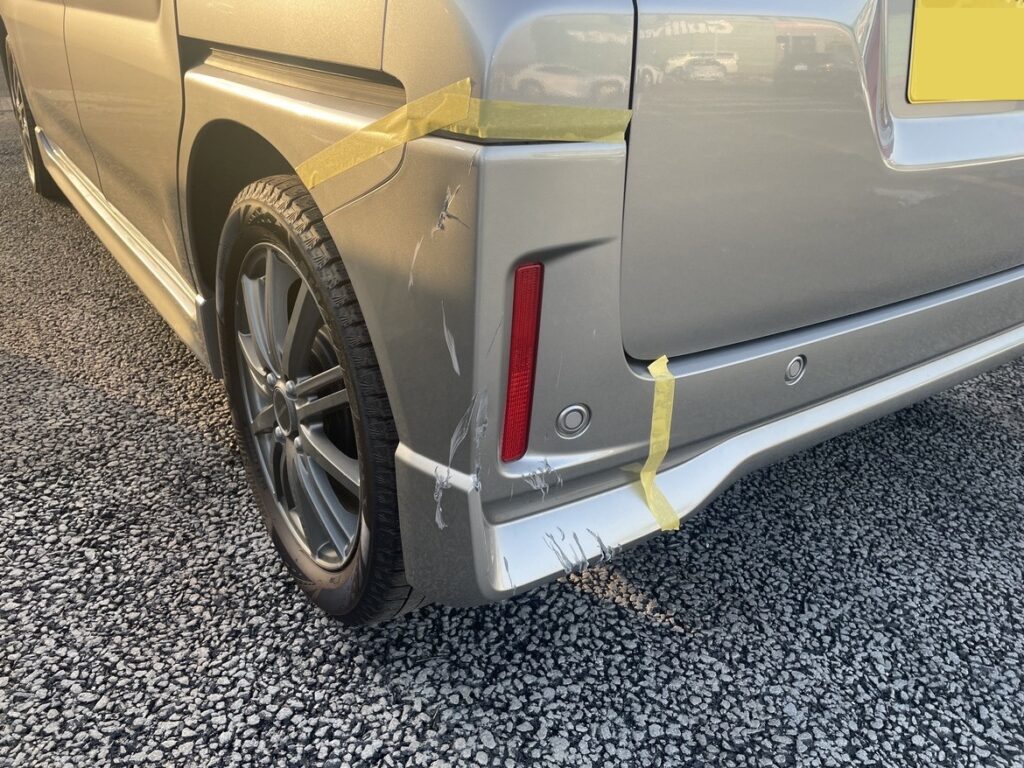 スズキ スペーシアカスタムのリアバンパーに、複数の深い擦り傷が確認できます。バンパーの角から下部にかけて、塗装が剥がれて下地が露出しているのがはっきりとわかります。