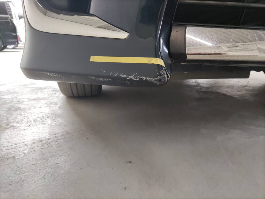 駐車する際に壁と接触してしまったのか、トヨタ ヴォクシーのフロントバンパーの右側に広範囲にわたる擦り傷がついていました。