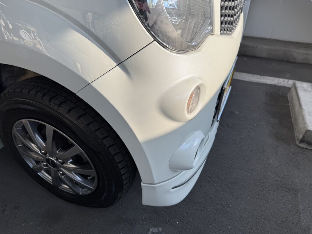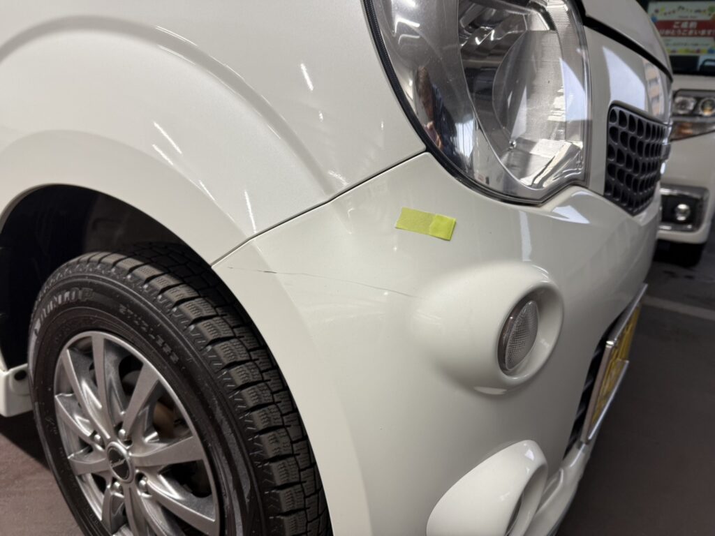 日産 モコのフロントバンパーに、長く鋭い線傷が確認できました。この種の傷は、障害物や他の車との軽微な接触によって生じることが多く、特にバンパーの下部や角にできると目立ちやすいです。