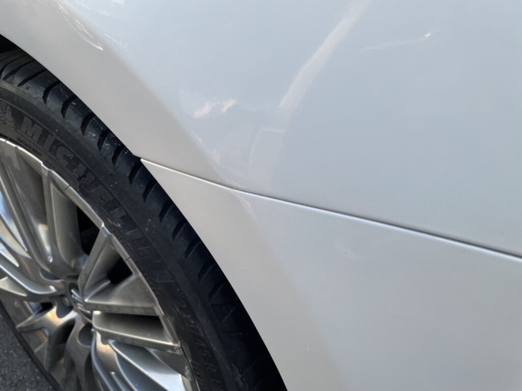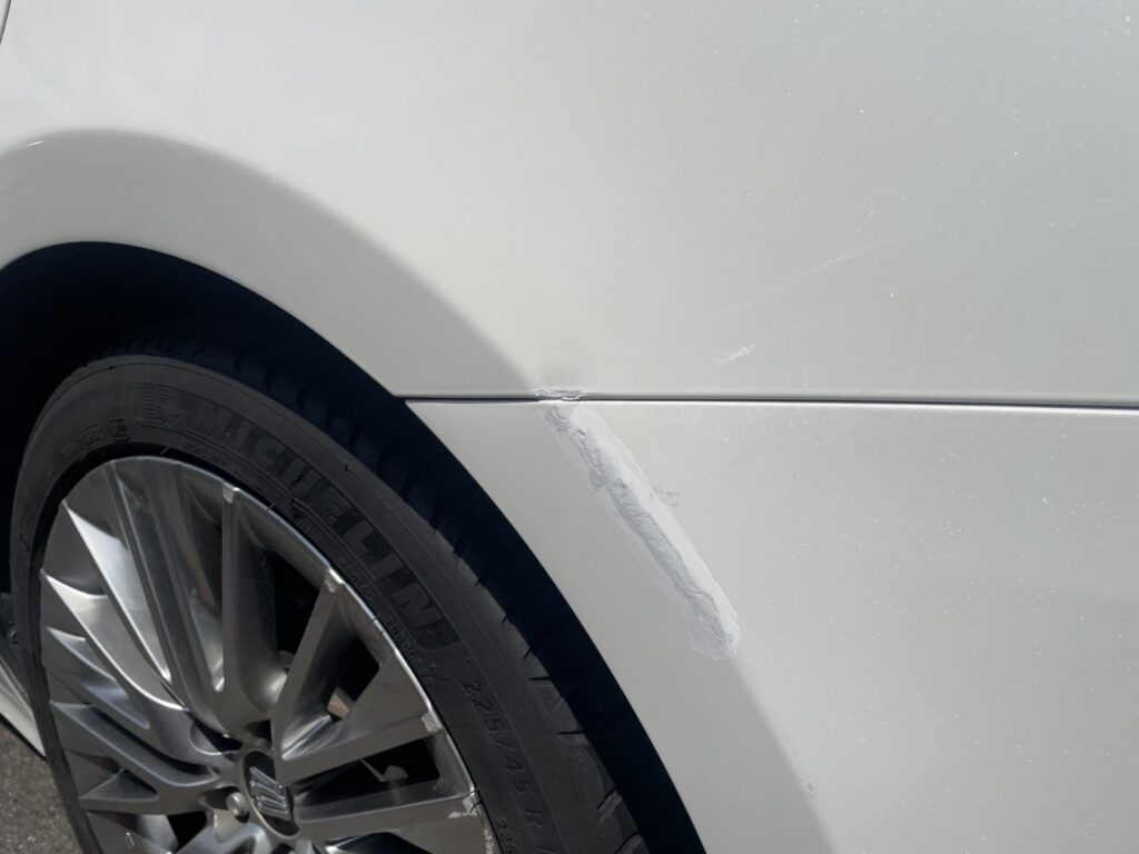 トヨタ クラウンのリアフェンダーに、前オーナー様がご自身で補修を試みたのか、傷を直した跡が見受けられました。本来のボディカラーと異なる色の塗料が使われており、凸凹した塗り跡も目立っていました。
