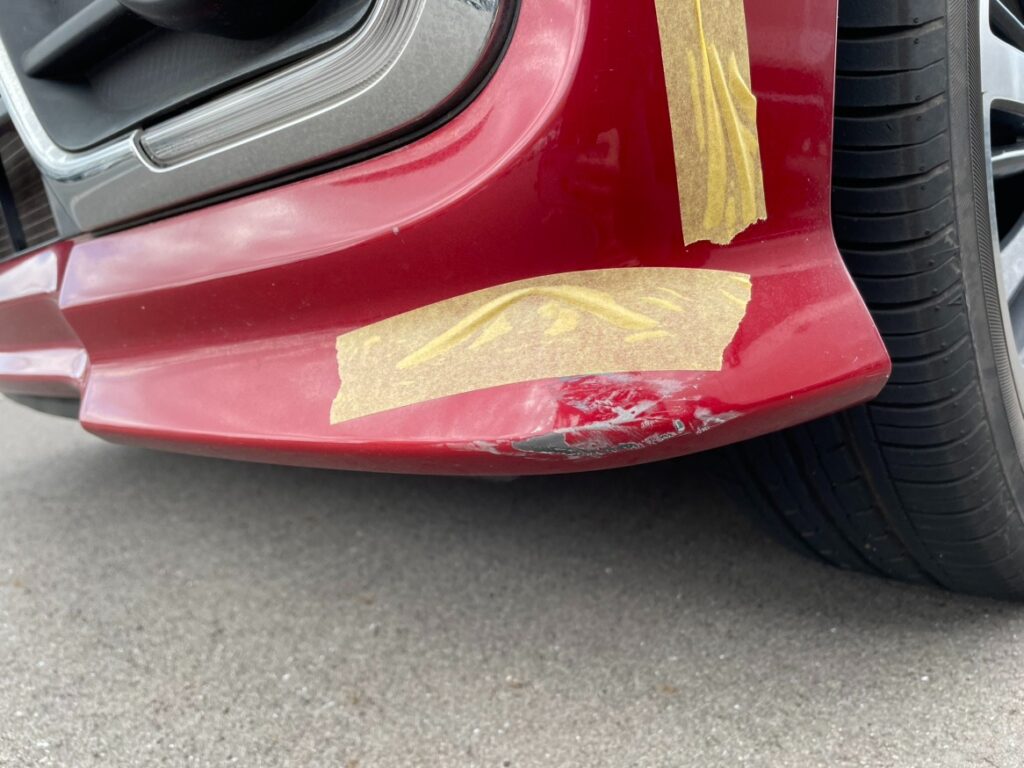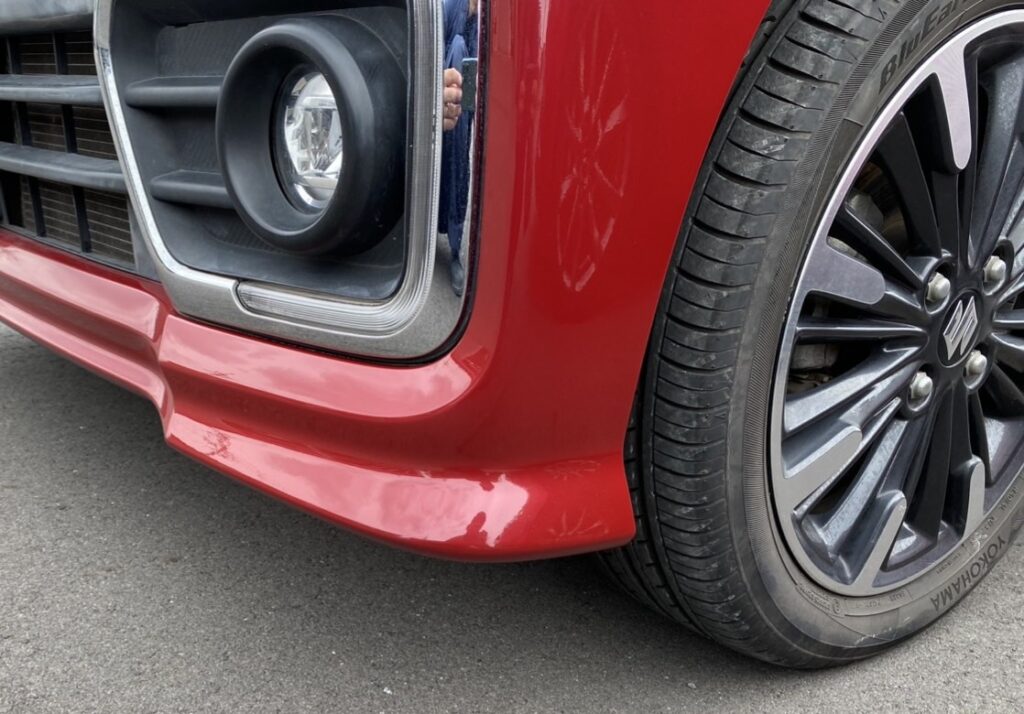 スズキ スペーシアのフロントバンパーに、深い擦り傷が確認できます。赤いボディカラーに対して塗装が剥がれ、下地が露出している箇所がはっきりと目立っていました。