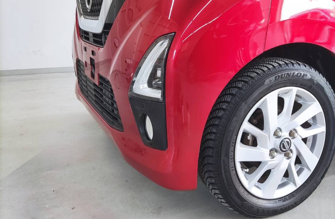 フロントバンパーの擦り傷が修復されました。損傷箇所を丁寧に下地から補修し、スペーシアの赤いボディカラーに合わせた調色と塗装を施しました。